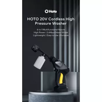 Hoto 20V Cordless High Pressure Washer 6-in-1 For Car Washer 2.4Mpa, 24bar, 350psi High Washing Power 5C 2000mAh Removable Battery 200W- Black