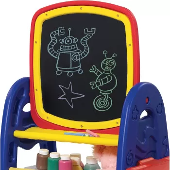 Multi-functions: Magnetic/Dry-erase, chalkboard & painting surfaces A Large drawing surface Flips easily to Magnetic/Dry-erase or chalkboardEZ fold for storage Includes: 1 Large paper clip,1 Storage Tray 1 Eraser