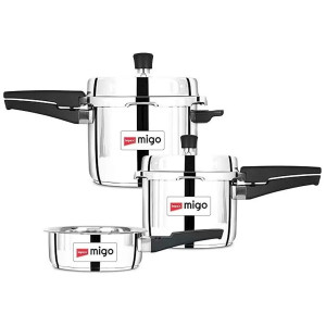 Impex Migo Stainless Steel Pressure Cooker Combo, 5L, 3L, 2L, Outer Lid, Induction And Gas Compatible, Anti-Bulging Base, Lead-Free Safety Valve, High Heat Efficiency, Sandwich Bottom, Ifc 235Ss