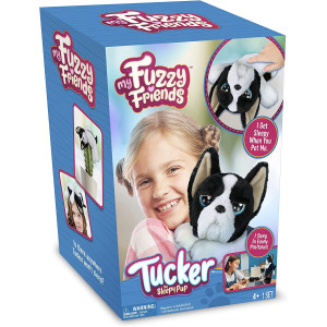 Tucker is the huggable, snuggable, cuddly puppy that falls asleep when you play. Pet his back, scratch his ears, or tickle his belly. Pet just the right spot and his big dreamy eyes will slowly close as he gently falls asleep. Tucker makes the cutest sounds. Soft floppy arms and legs help him snooze in the silliest positions...Is there anywhere he won't sleep?